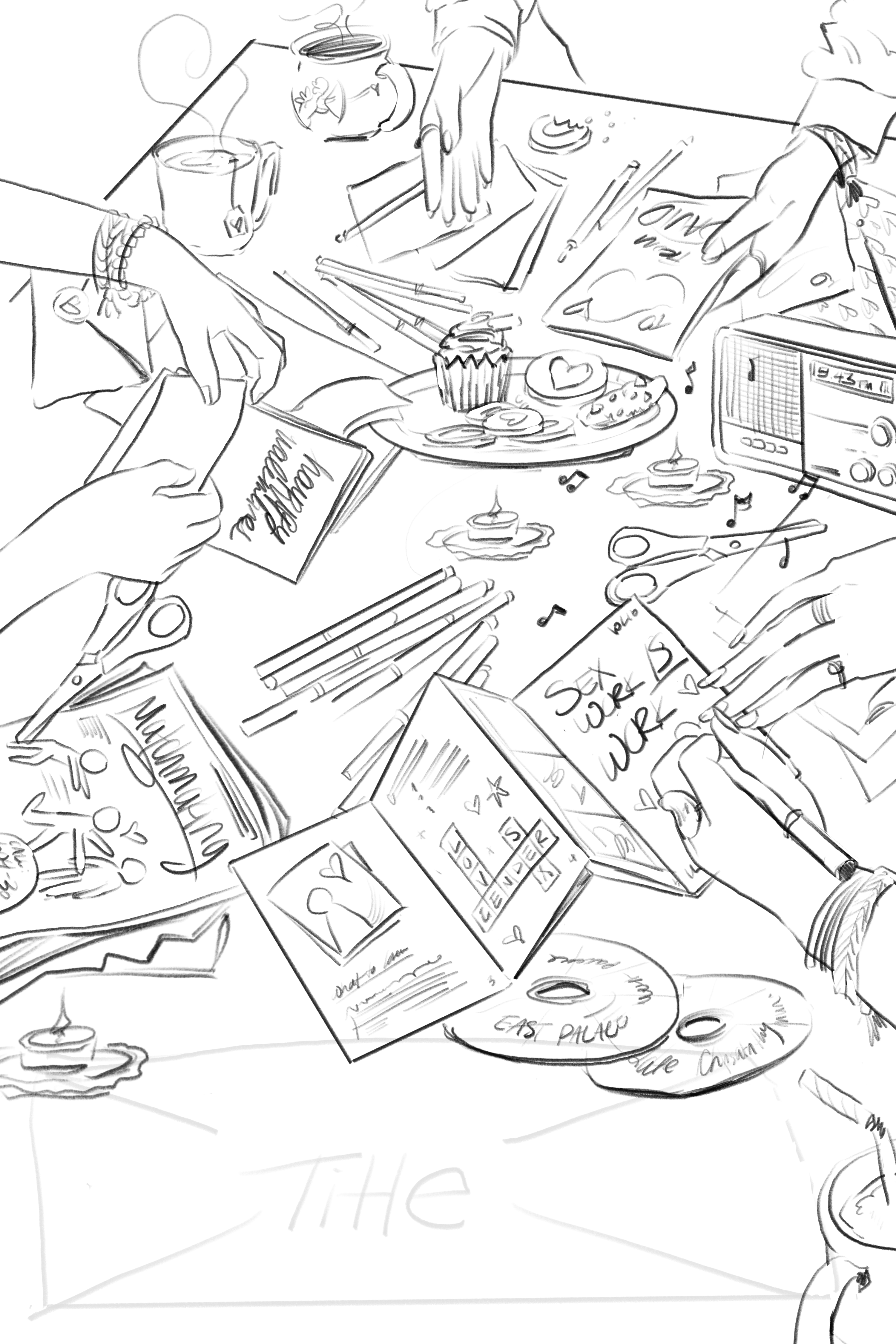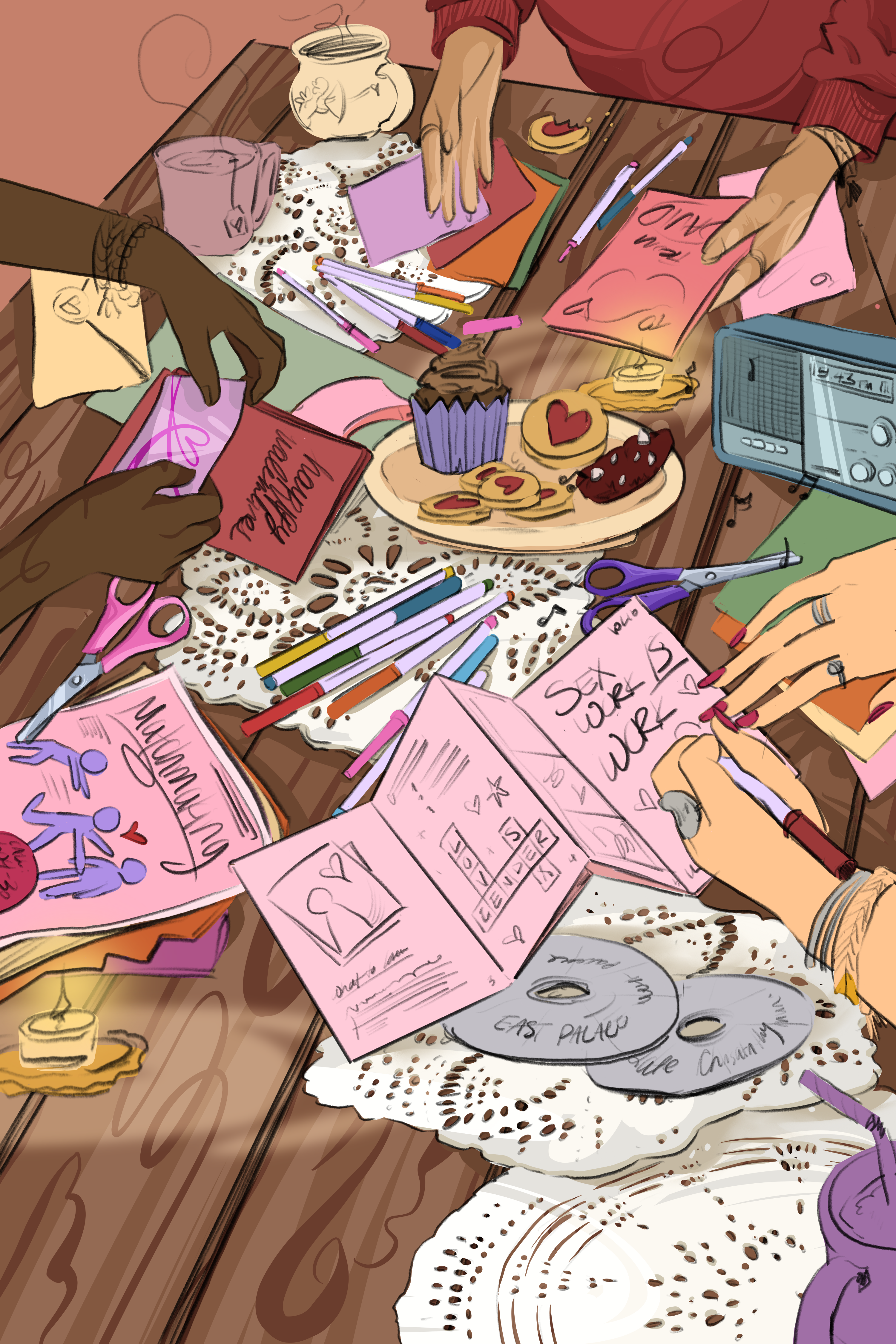 This year, we're going to focus the main illustration around a scene of people making zines and Valentine's Day cards. This will be a fun way to incorporate a lot of Valentine's Day imagery and also easter eggs from our articles. The view will be of a table with a bunch of craft materials on it. We want to see 3-ish people separately making zines, but not their faces. Maybe we can just see their hands. One of them could have cool painted nails or rings on.